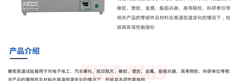 用途:精密高溫試驗箱用于對電子電工、汽車摩托、航空航天、橡膠、塑膠、金屬、船舶兵器、高等院校、科研單位等相關(guān)產(chǎn)品的零部件及材料在高溫恒溫變化的情況下,檢驗其各項性能指標(biāo)