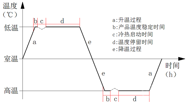 熱循環(huán)試驗(yàn)是一種利用高低溫交變濕熱試驗(yàn)箱對試驗(yàn)產(chǎn)品進(jìn)行的預(yù)設(shè)高低溫交替的應(yīng)力考核,用以驗(yàn)證材料和產(chǎn)品是否達(dá)到在研發(fā)、設(shè)計、制造中預(yù)期的質(zhì)量目標(biāo)的一類可靠性試驗(yàn)。通過大溫變速率可暴露產(chǎn)品潛在的材料與性能缺陷,經(jīng)過不斷地質(zhì)量改進(jìn),達(dá)到可靠性提升的目的。航天單機(jī)類產(chǎn)品一次熱循環(huán)示意圖見下圖1所示。