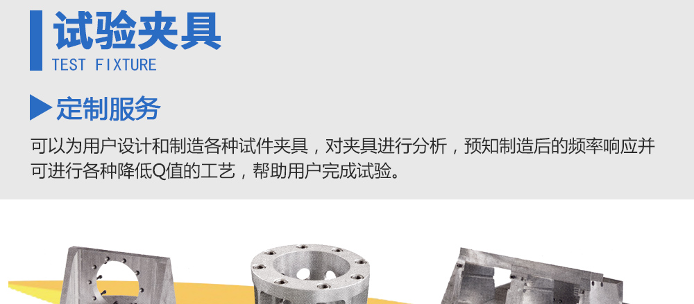 用途:可以為用戶(hù)設(shè)計(jì)和制造各種試件夾具,對(duì)夾具進(jìn)行分析,預(yù)知制造后的頻率響應(yīng)并可進(jìn)行各種降低Q值的工藝,幫助用戶(hù)完成試驗(yàn)。