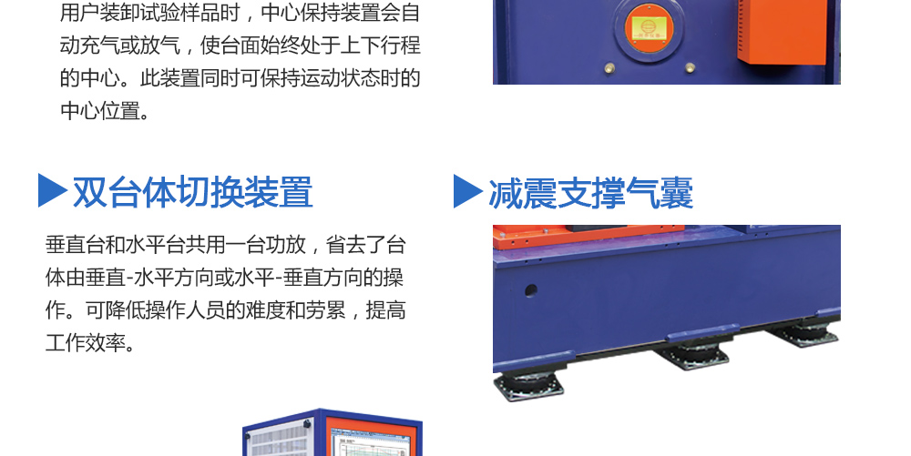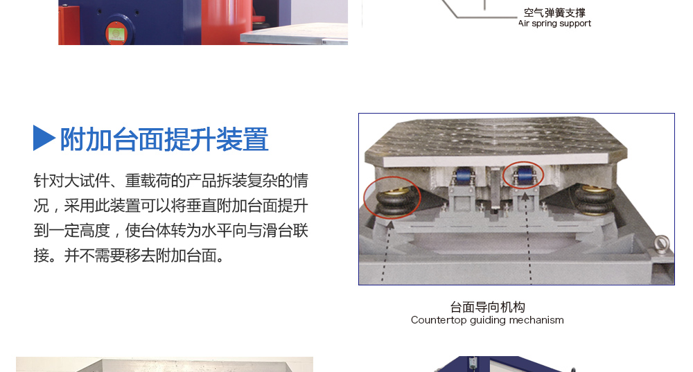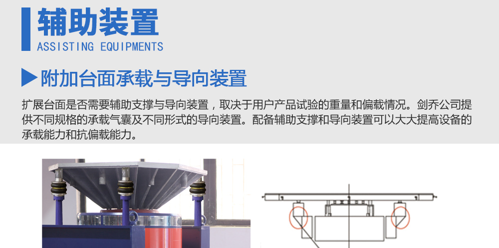 用途:擴(kuò)展臺面是否需要輔助支撐與導(dǎo)向裝置,取決于用戶產(chǎn)品試驗(yàn)的重量和偏載情況。劍喬公司提供不同規(guī)格的承載氣囊及不同形式的導(dǎo)向裝置。配備輔助支撐和導(dǎo)向裝置可以大大提高設(shè)備的承載能